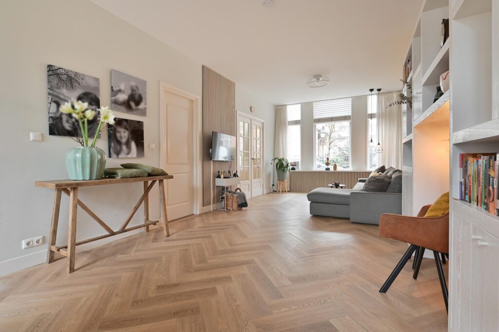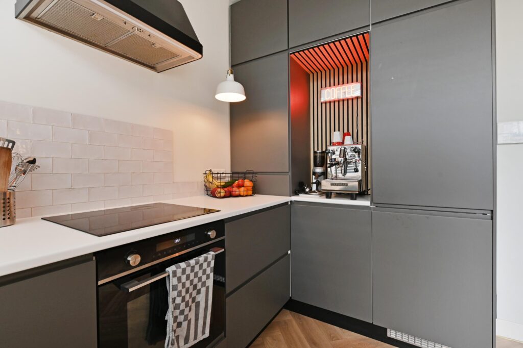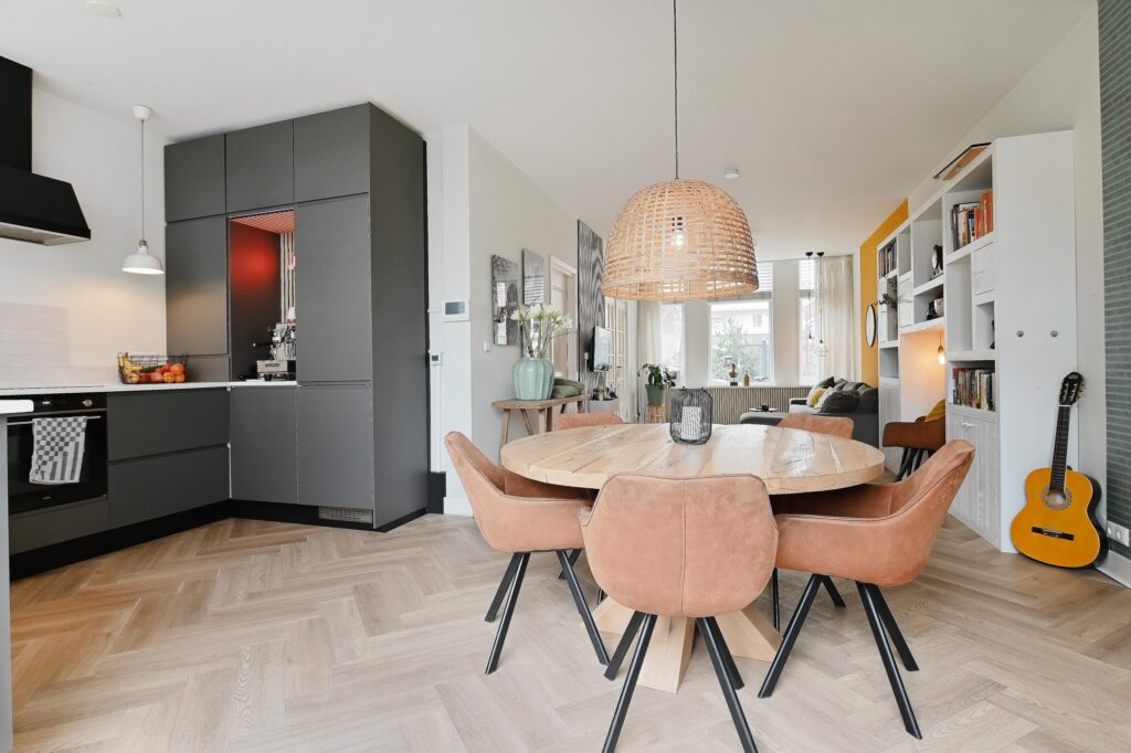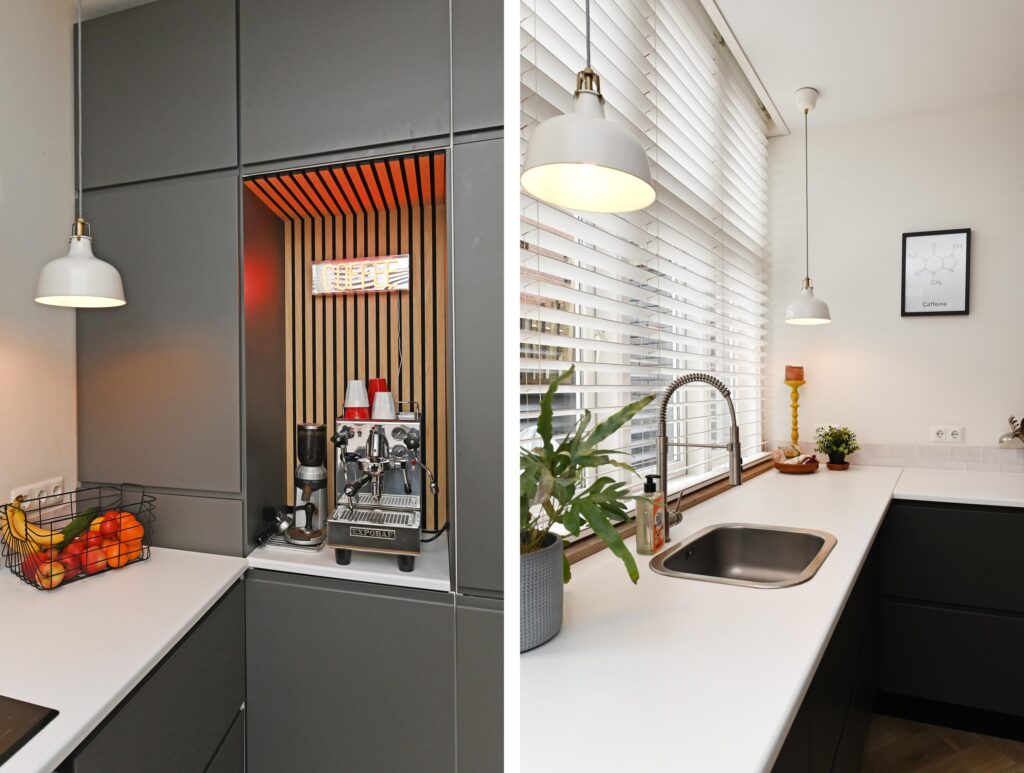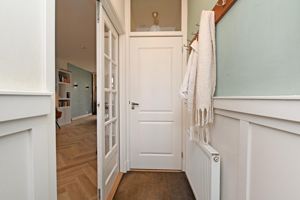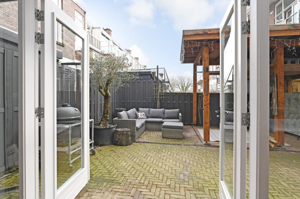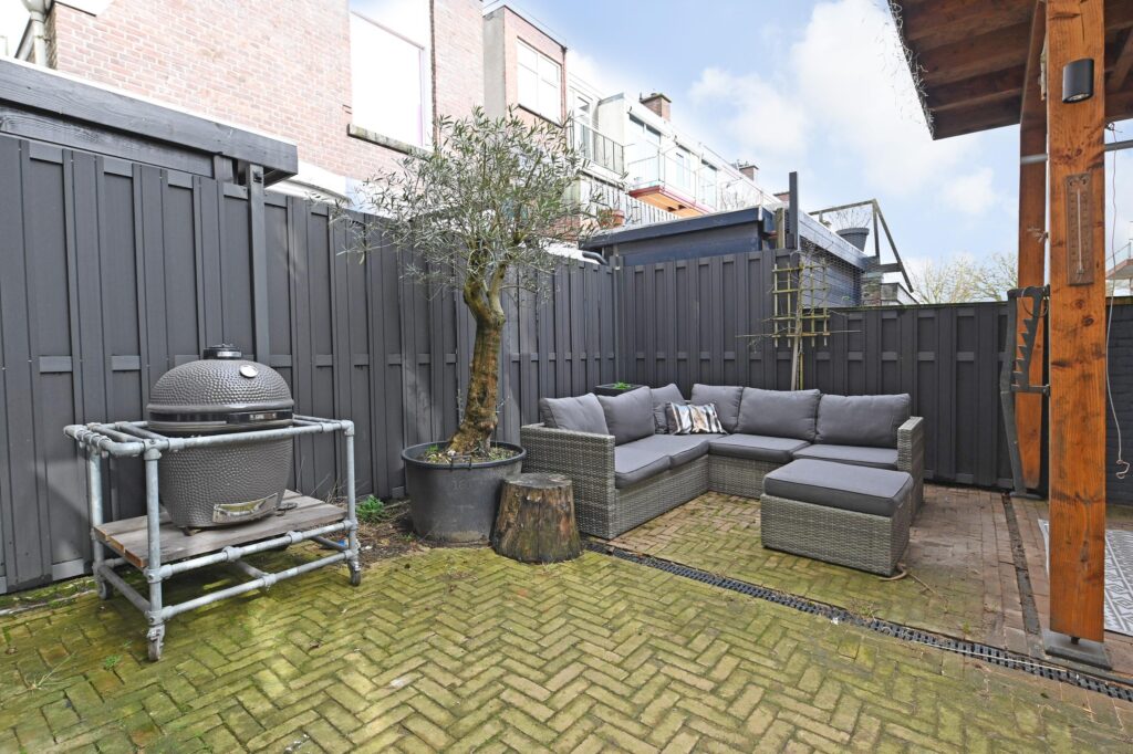 De moderne keuken is uitgerust met diverse inbouwapparatuur en een gezellige koffiehoek. Woonkamer en keuken zijn afgewerkt met een stijlvolle visgraatvloer en voorzien van comfortabele vloerverwarming. Via openslaande deuren bereikt u de zonnige achtertuin op het zuidoosten, waar u in alle rust van het buitenleven kunt genieten.