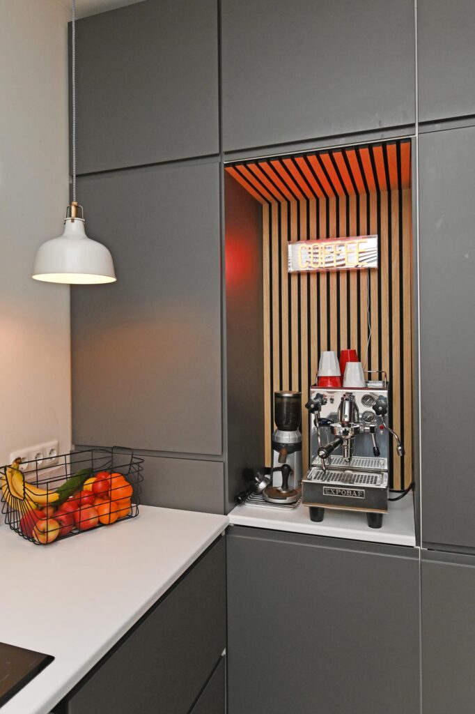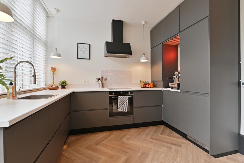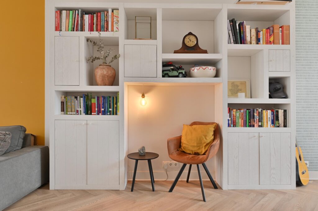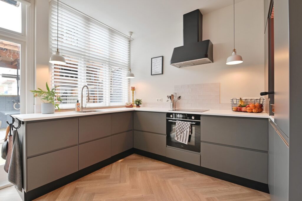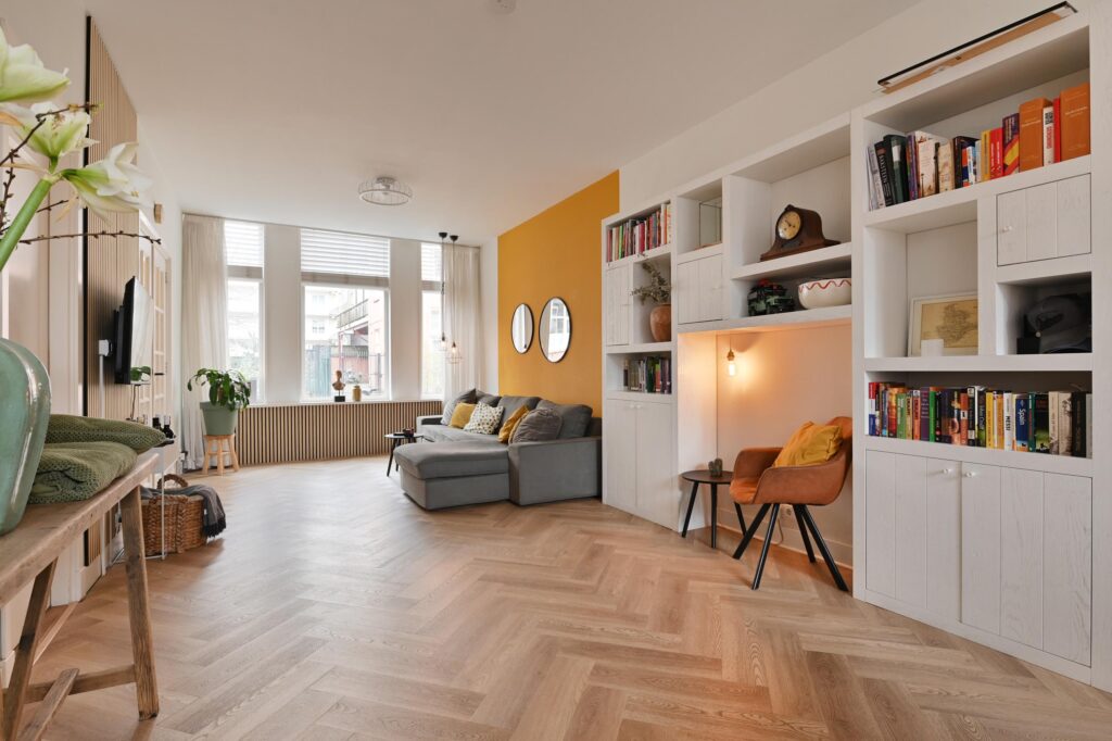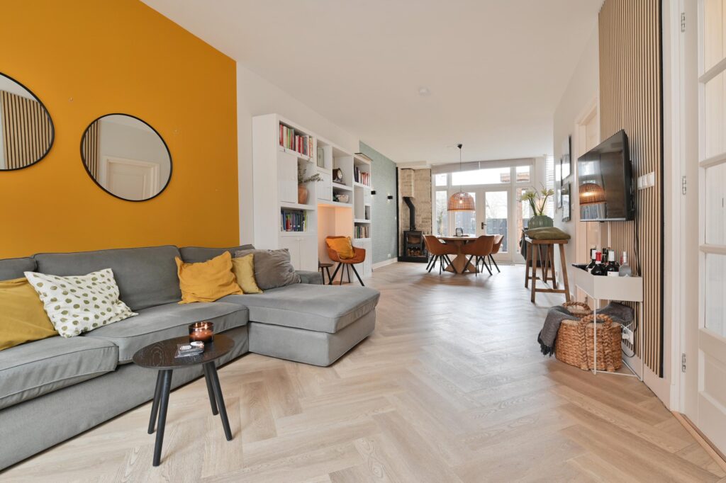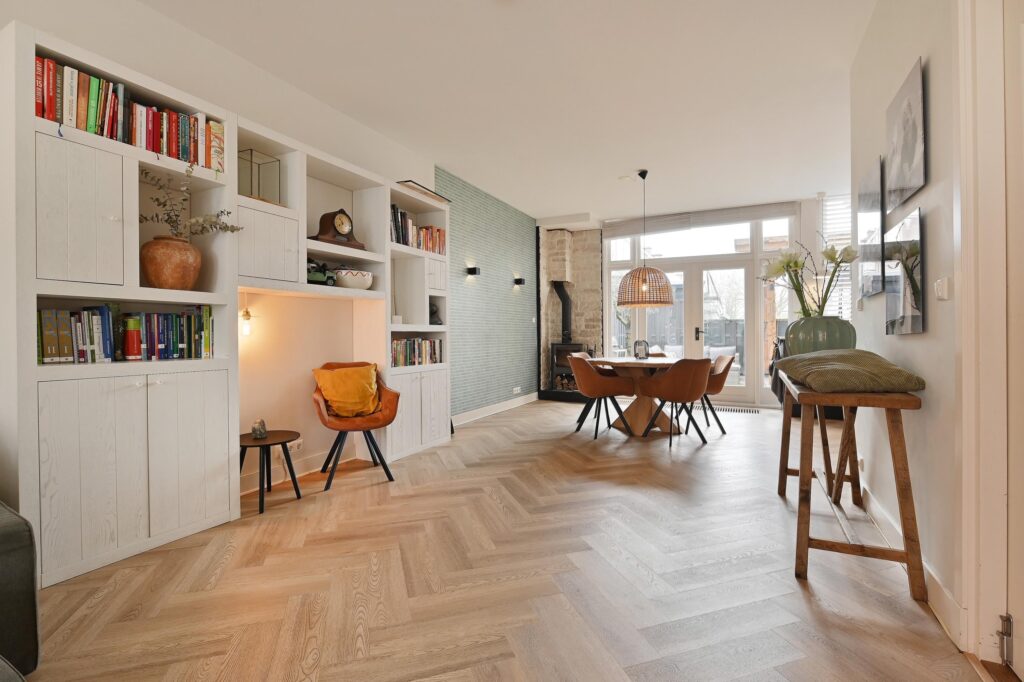 De moderne keuken is uitgerust met diverse inbouwapparatuur en een gezellige koffiehoek. Woonkamer en keuken zijn afgewerkt met een stijlvolle visgraatvloer en voorzien van comfortabele vloerverwarming. Via openslaande deuren bereikt u de zonnige achtertuin op het zuidoosten, waar u in alle rust van het buitenleven kunt genieten.