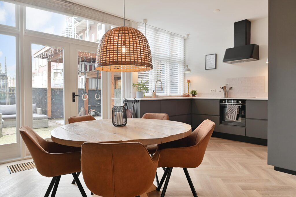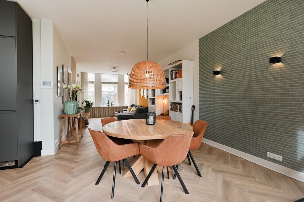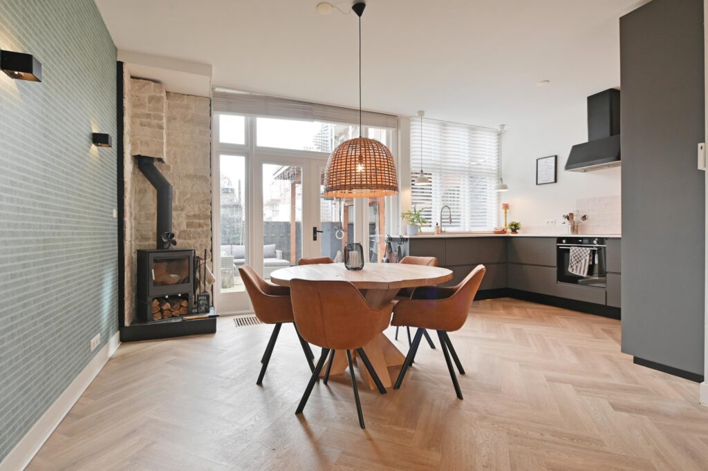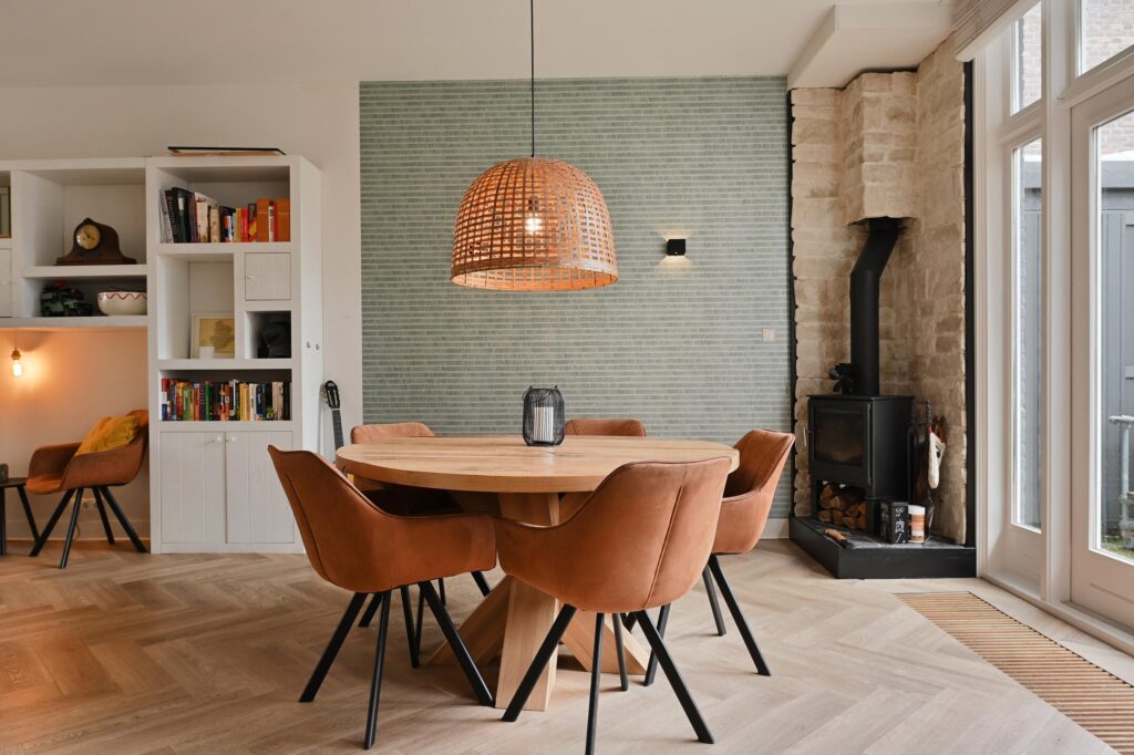 Via de entree op de begane grond komt u in de hal, waar zich een toilet met fontein bevindt en toegang wordt geboden tot de woon-/eetkamer. Deze lichte leefruimte vormt het hart van de woning en valt op door de prettige lichtinval aan zowel de voor- als achterzijde. De open keuken en de houtkachel zorgen samen voor een warme en uitnodigende sfeer.