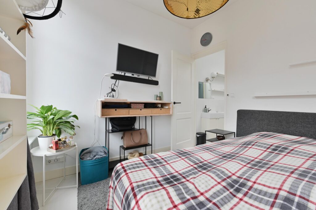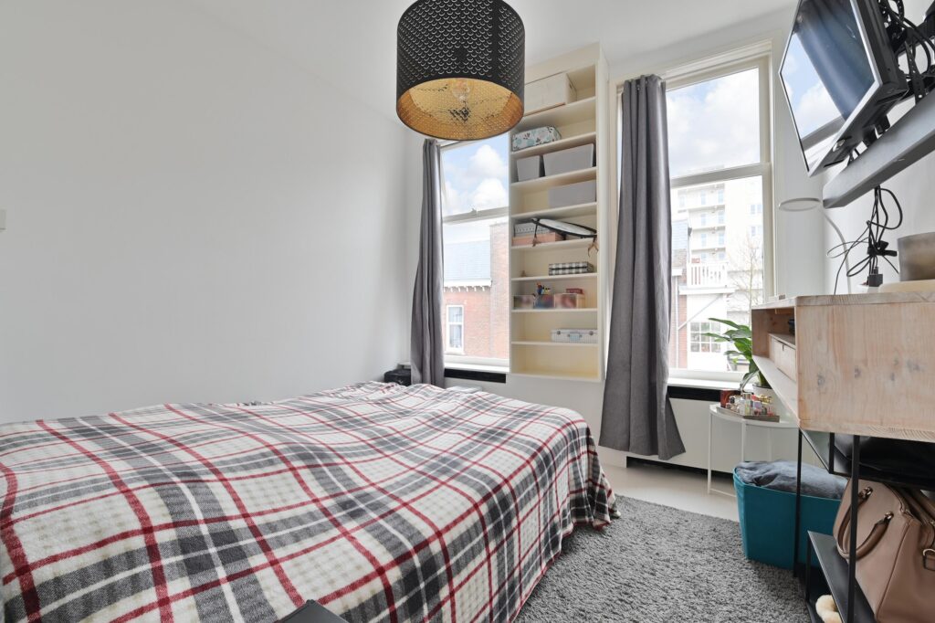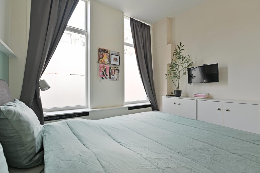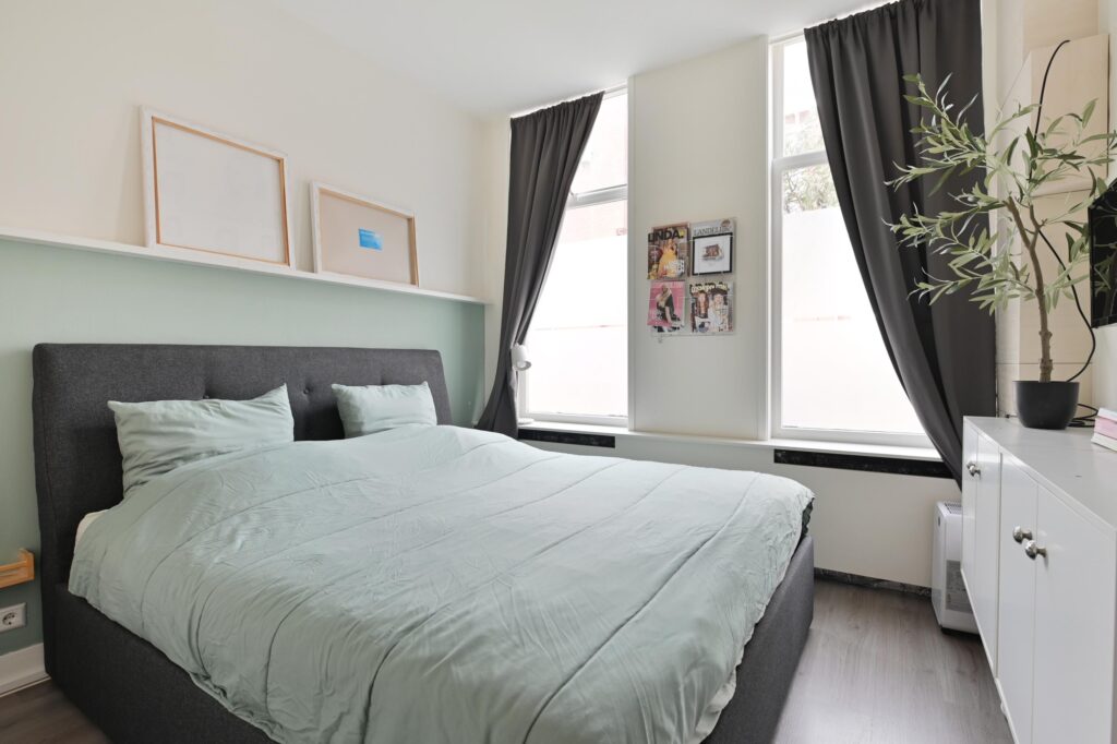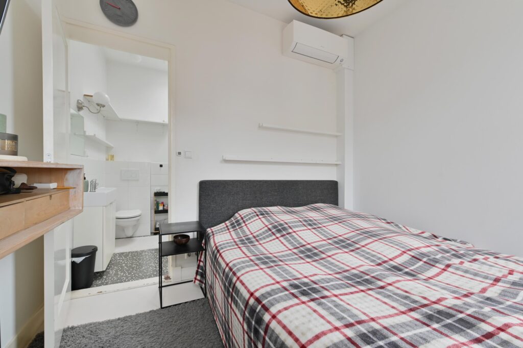 Overloop met een ruime slaapkamer, eveneens uitgerust met airconditioning.