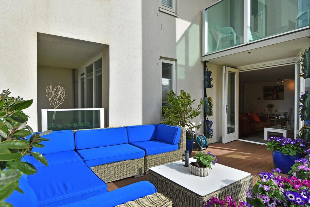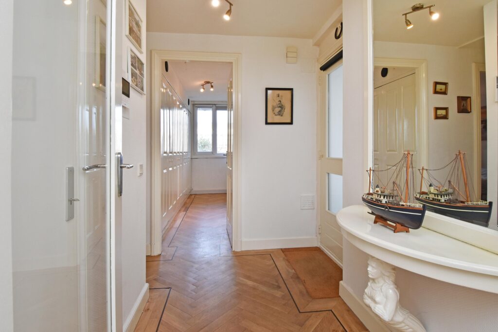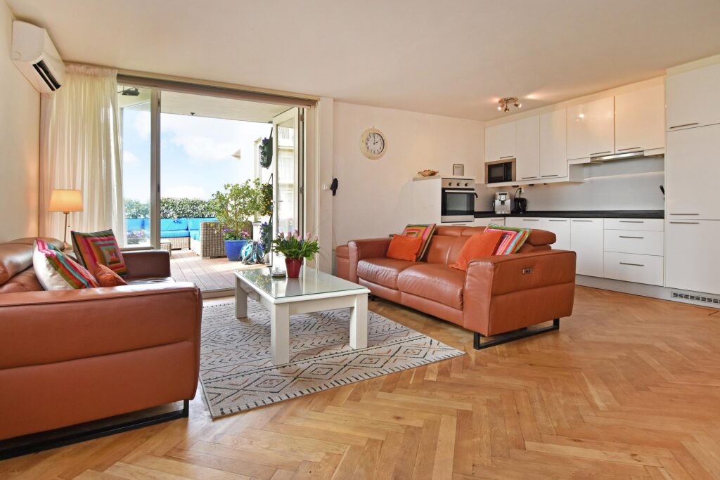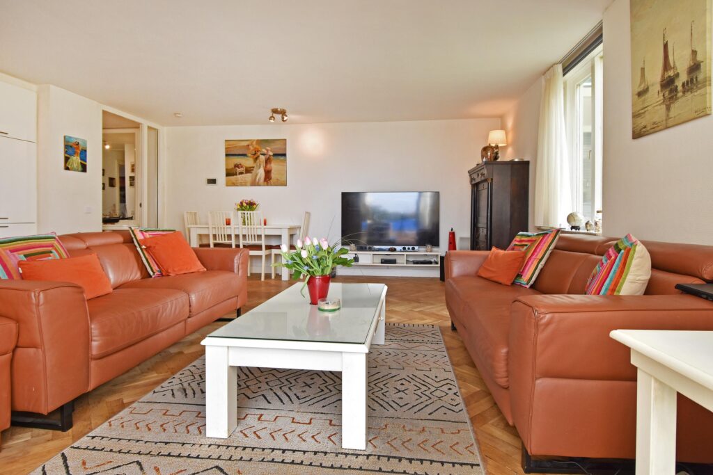 De L-vormige hal geeft toegang tot alle vertrekken van de woning. De heerlijk op de hoek gelegen woonkamer biedt een fraai zeezicht en een leuk uitzicht over de Gevers Deynootweg. De lichte woonkamer beschikt over openslaande deuren naar het heerlijke terras met prachtig zeezicht. Het terras is circa 16 m² groot.
