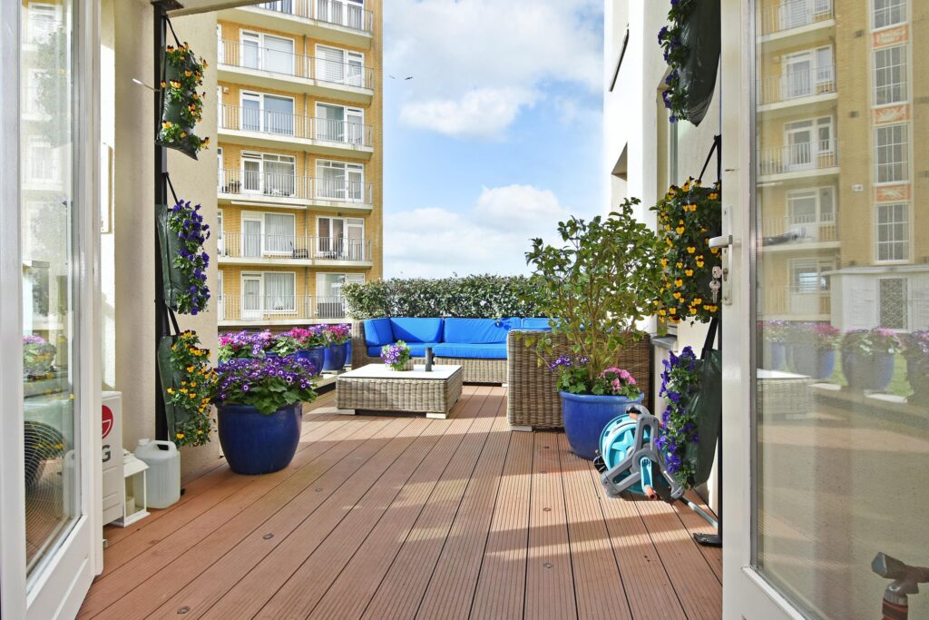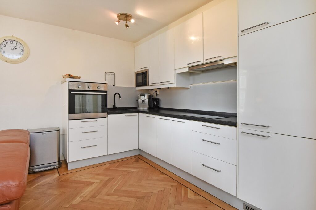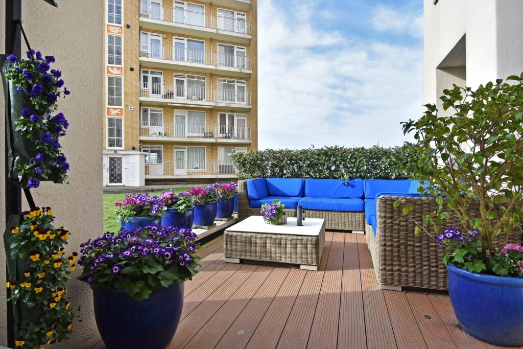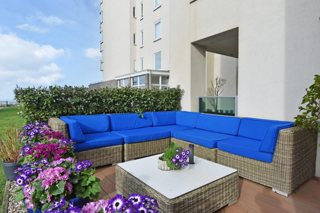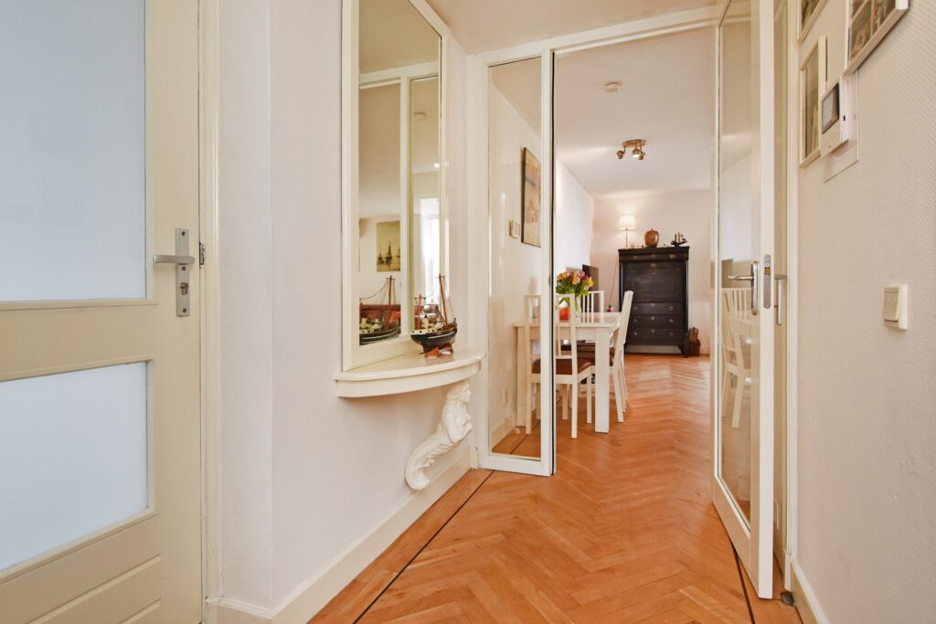 De L-vormige hal geeft toegang tot alle vertrekken van de woning. De heerlijk op de hoek gelegen woonkamer biedt een fraai zeezicht en een leuk uitzicht over de Gevers Deynootweg. De lichte woonkamer beschikt over openslaande deuren naar het heerlijke terras met prachtig zeezicht. Het terras is circa 16 m² groot.