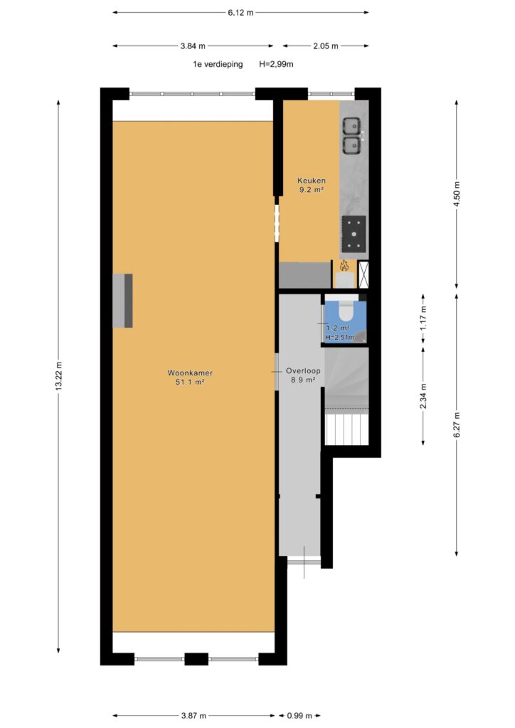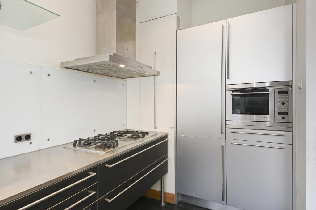 Via de entree op de eerste verdieping komt u binnen in de hal, die toegang biedt tot een separaat toilet en de woonkamer. Via de woonkamer bereikt u de keuken (merk Bulthaup) met CV-opstelplaats.