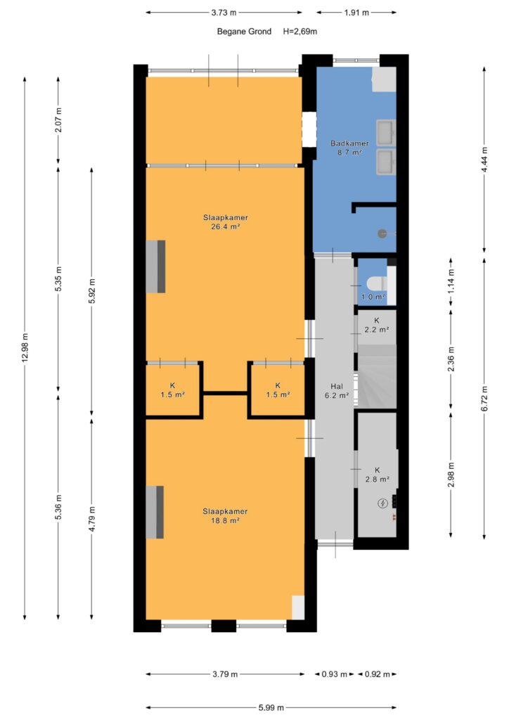 Op de begane grond (met ook een aparte entree) bevinden zich aan de voor- en achterzijde twee ruime slaapkamers en de badkamer. De badkamer is royaal opgezet (ca. 8,7 m²) en voorzien van 2 wastafels, douche en wasmachineaansluiting. Ook op deze verdieping is een separaat toilet. In de grote slaapkamer bevinden zich 2 grote handige kasten alsmede openslaande deuren naar de tuin met achteringang naar het rustige gedeelte van de Beeklaan.