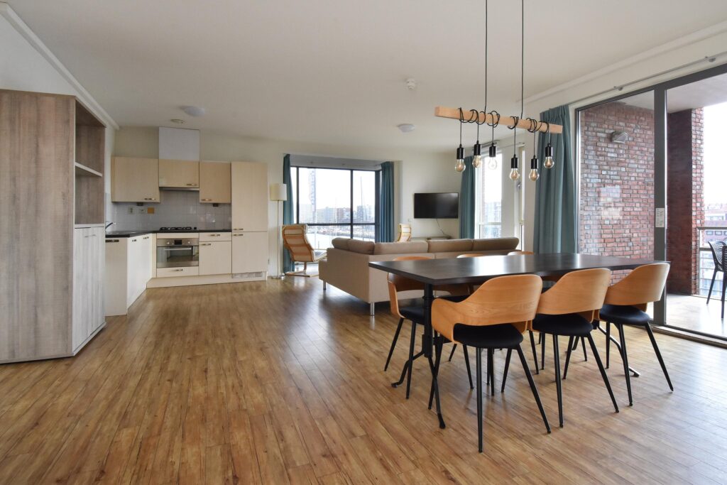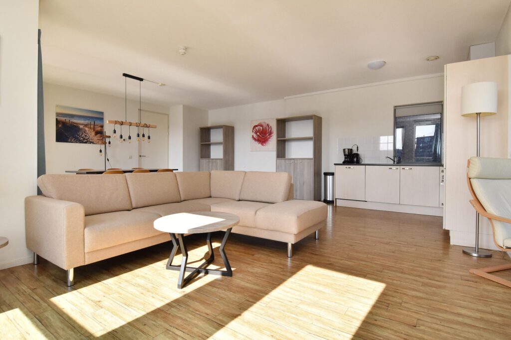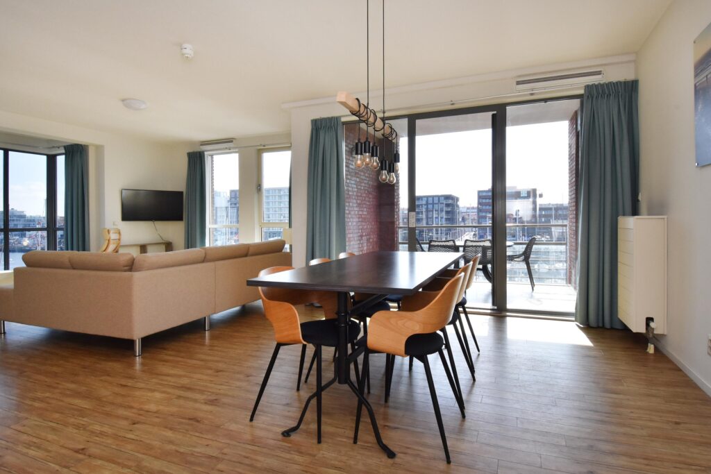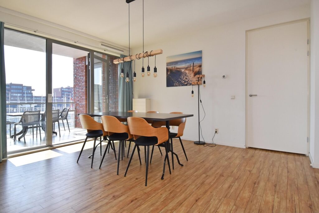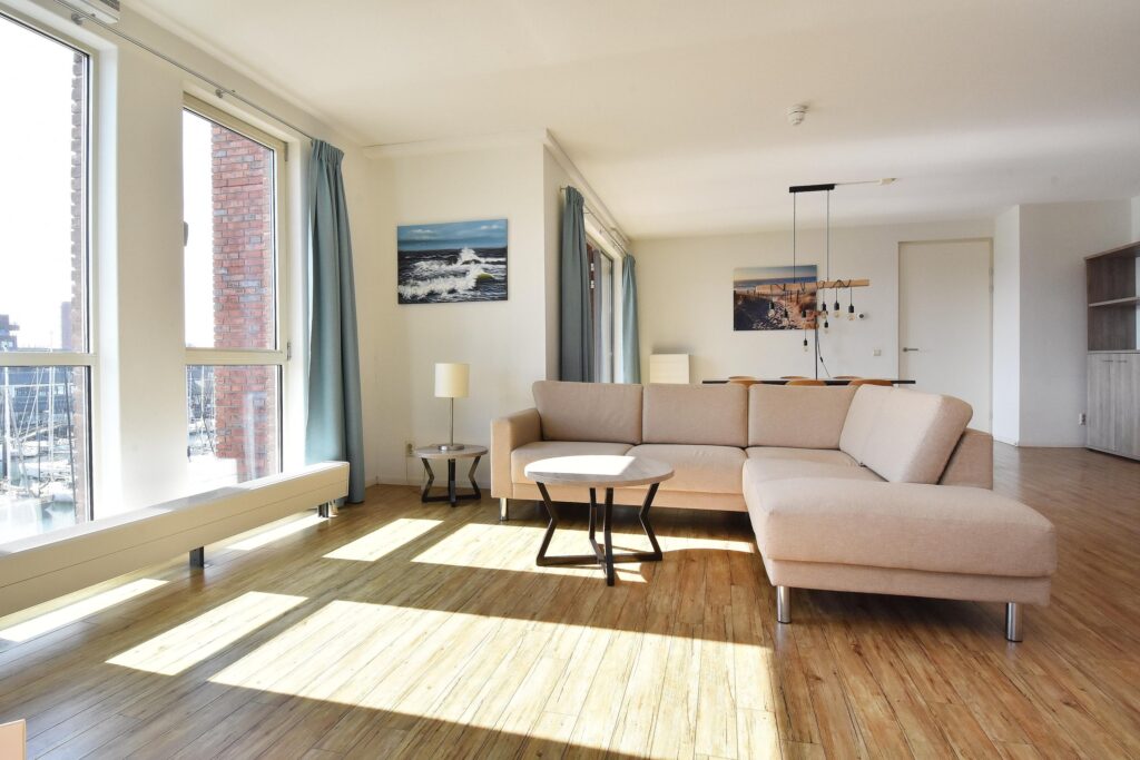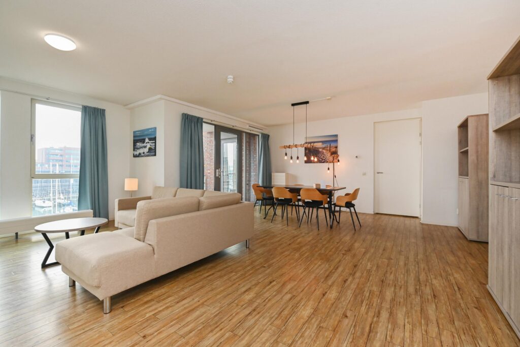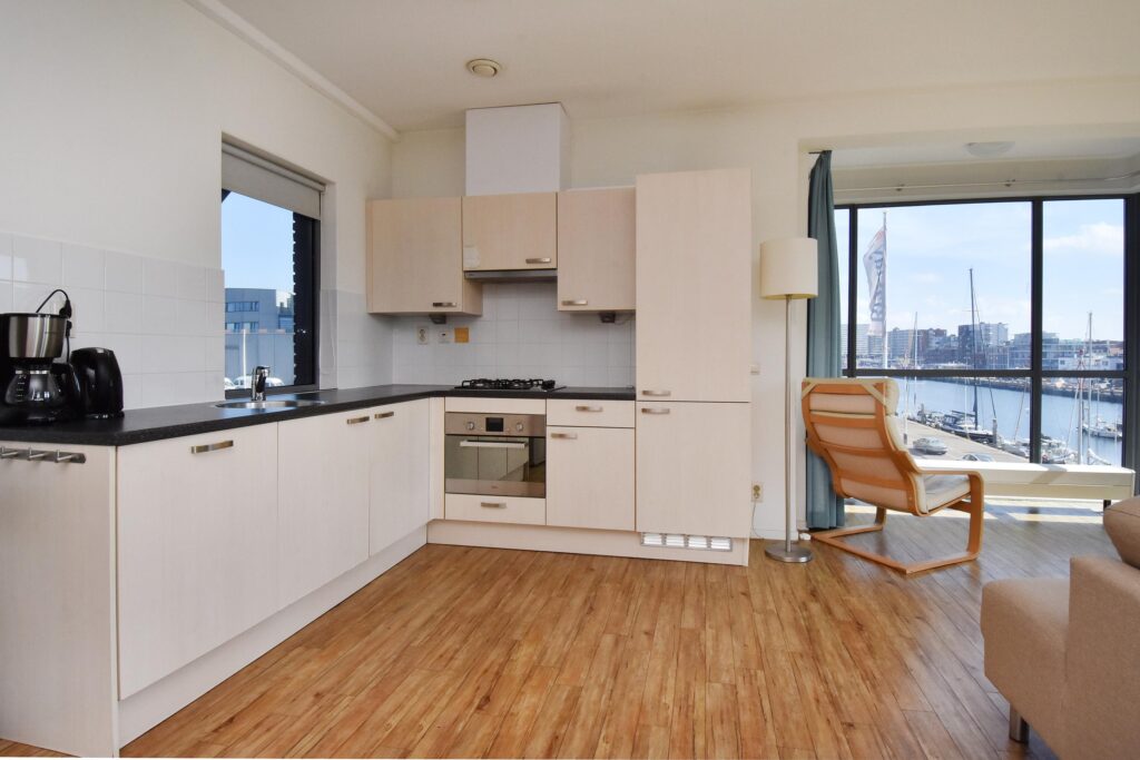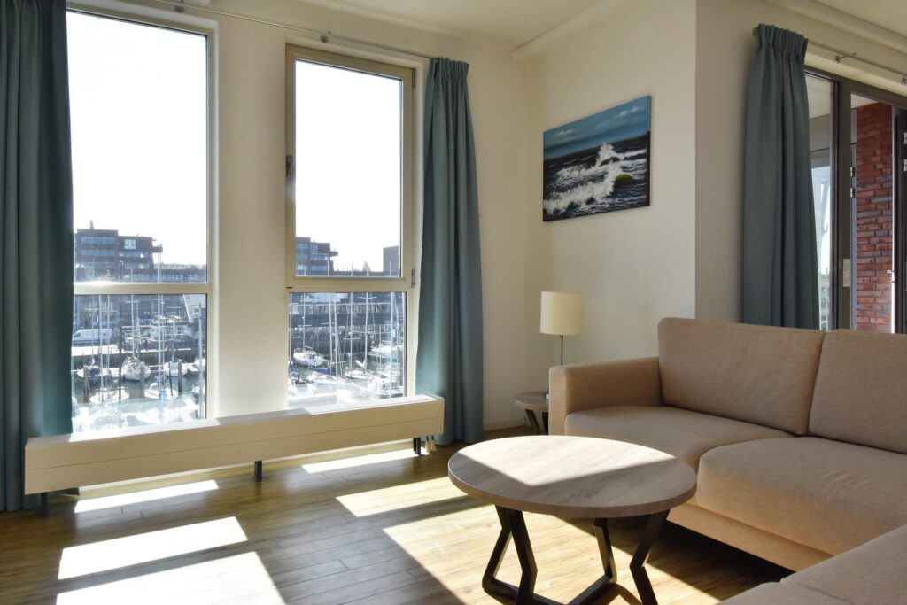 De royale woon-/eetkamer is voorzien van een open keuken en beschikt over een mooie lichtinval en een fraai uitzicht. Vanuit de erker kijkt u uit over zee, terwijl het balkon aan de achterzijde uitzicht biedt op de levendige haven.