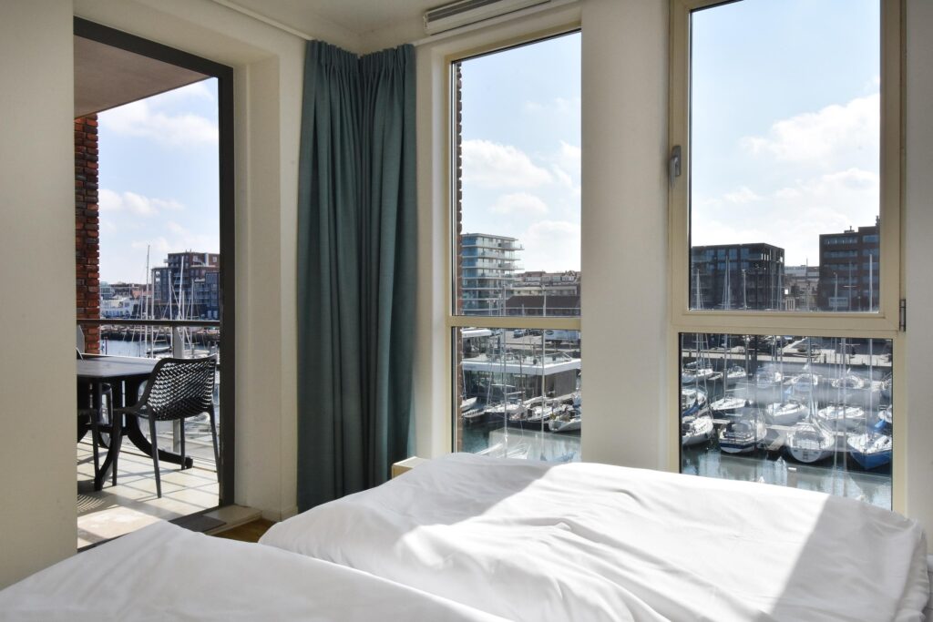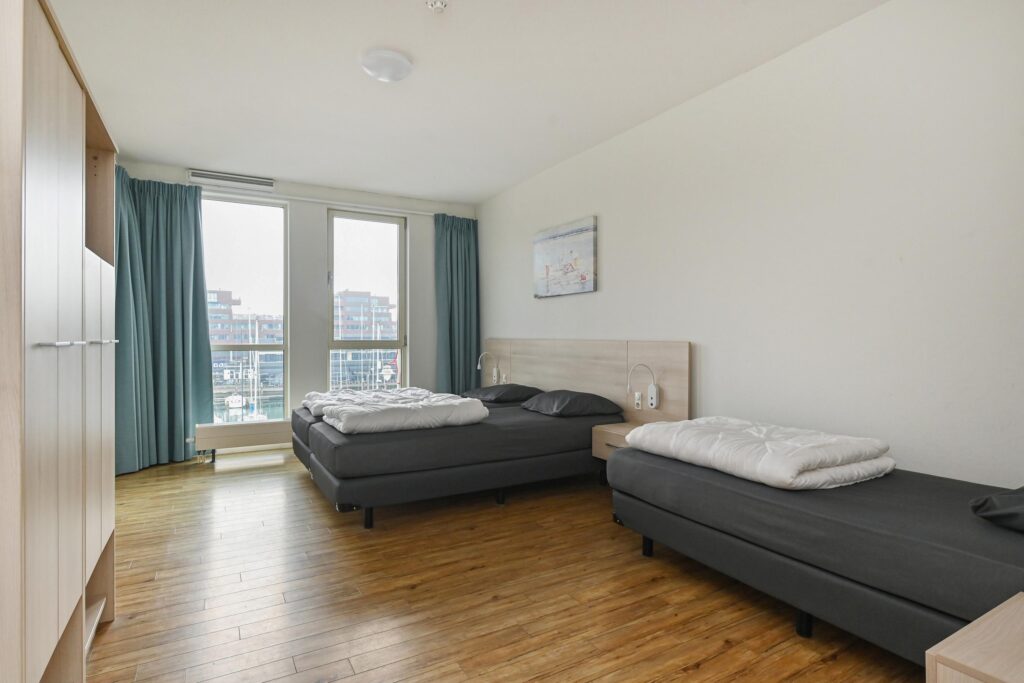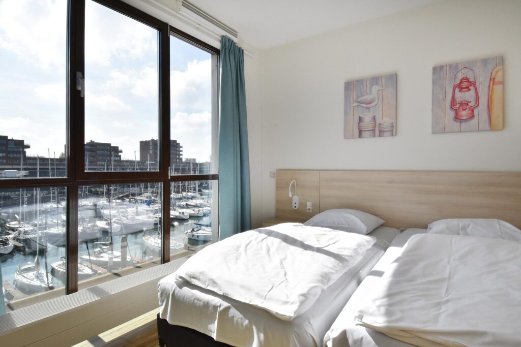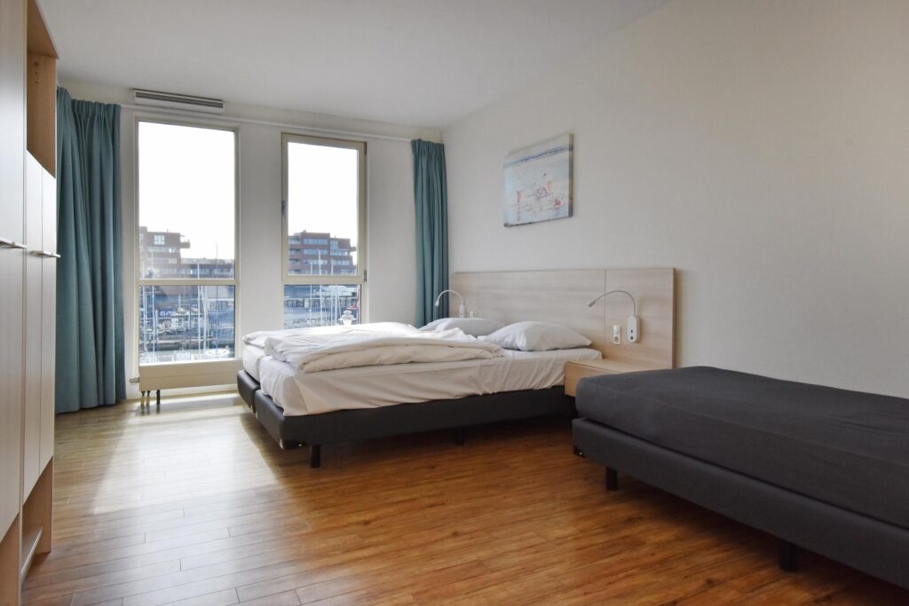 Twee ruime slaapkamers met uitzicht over de haven, waarvan een slaapkamer toegang verleent naar het balkon.