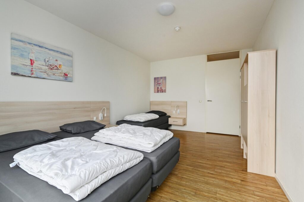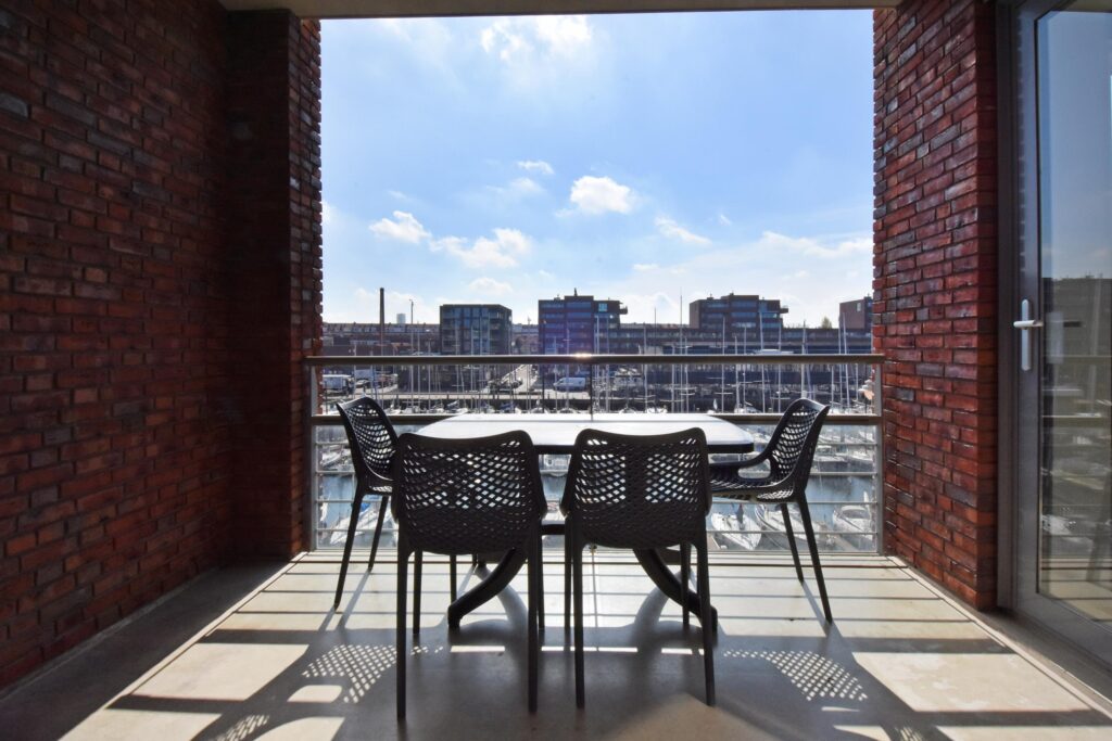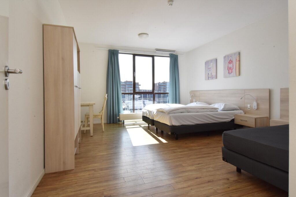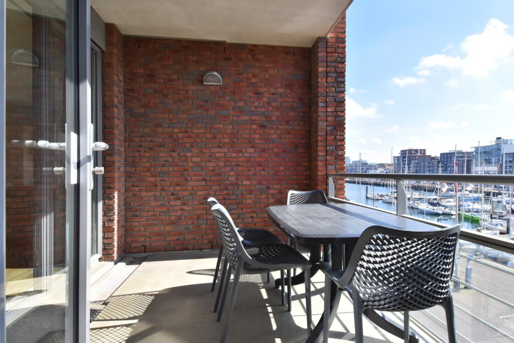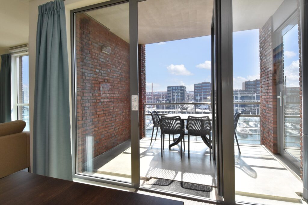 Twee ruime slaapkamers met uitzicht over de haven, waarvan een slaapkamer toegang verleent naar het balkon.