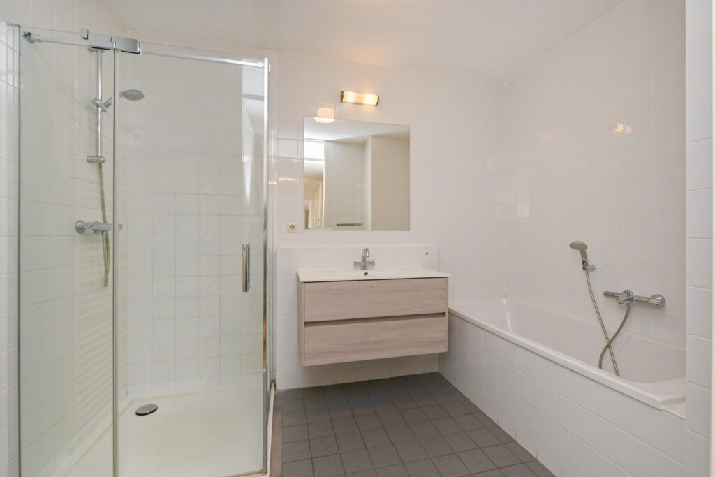 Ruime badkamer met douchecabine, ligbad en wastafel. Separaat toilet.